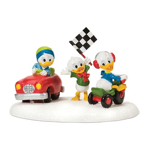Remove surface dust with fine brush or feather duster use no liquid cleaners.Heuy Dewie and Louie in car one with checkered flag one on 4 wheeler accessory figurine.Disney Village accessory figurine.Made from Porcelain.Decoration not a toy..
