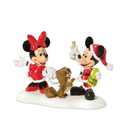 Mickey and Minnie dressed in Santa outfits giving dog treats to begging dog accessory figurine Decoration not a toy remove surface dust with fine brush or feather duster use no liquid cleaners Porcelain Disney Village accessory figurine