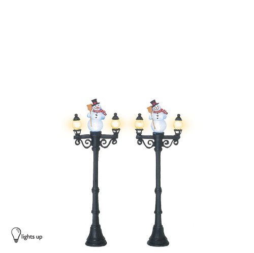 Each lamp measures nearly 5 inches tall LED lamps require 2 C-size batteries, or can use an AC/DC Adapter, which is sold separately Set of 2 miniature street lamps topped with snowmen; complements a mini display village The Village landscape accessories designed and manufactured exclusively by Department 56 Pieces are crafted and painted by hand