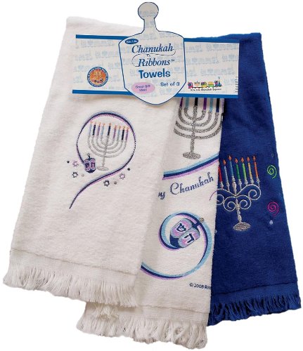 'Chanukah Ribbons' pattern. Great hostess gift. Cotton 2 embroidered towels and 1 printed towel
